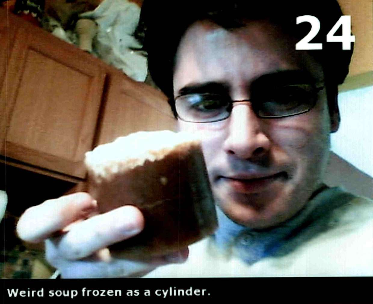 Weird soup frozen as a cylinder.