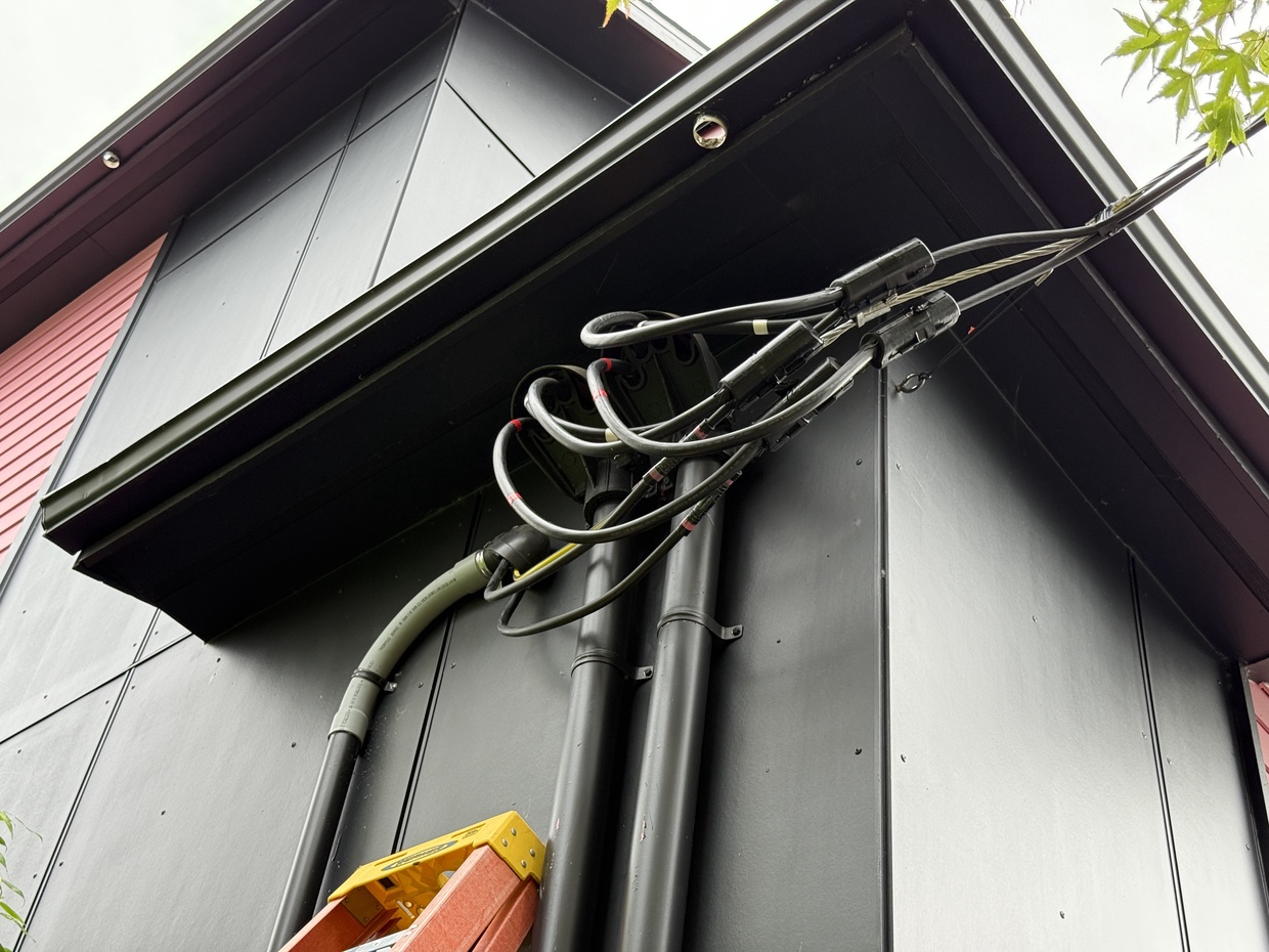 It looked like it almost wasn't going to happen there for a bit, but the crew pulled through! A very quick tree trim, an extra supply run to get thicker wire, and a quick reroute of the conduit for the main line and we're back in business.