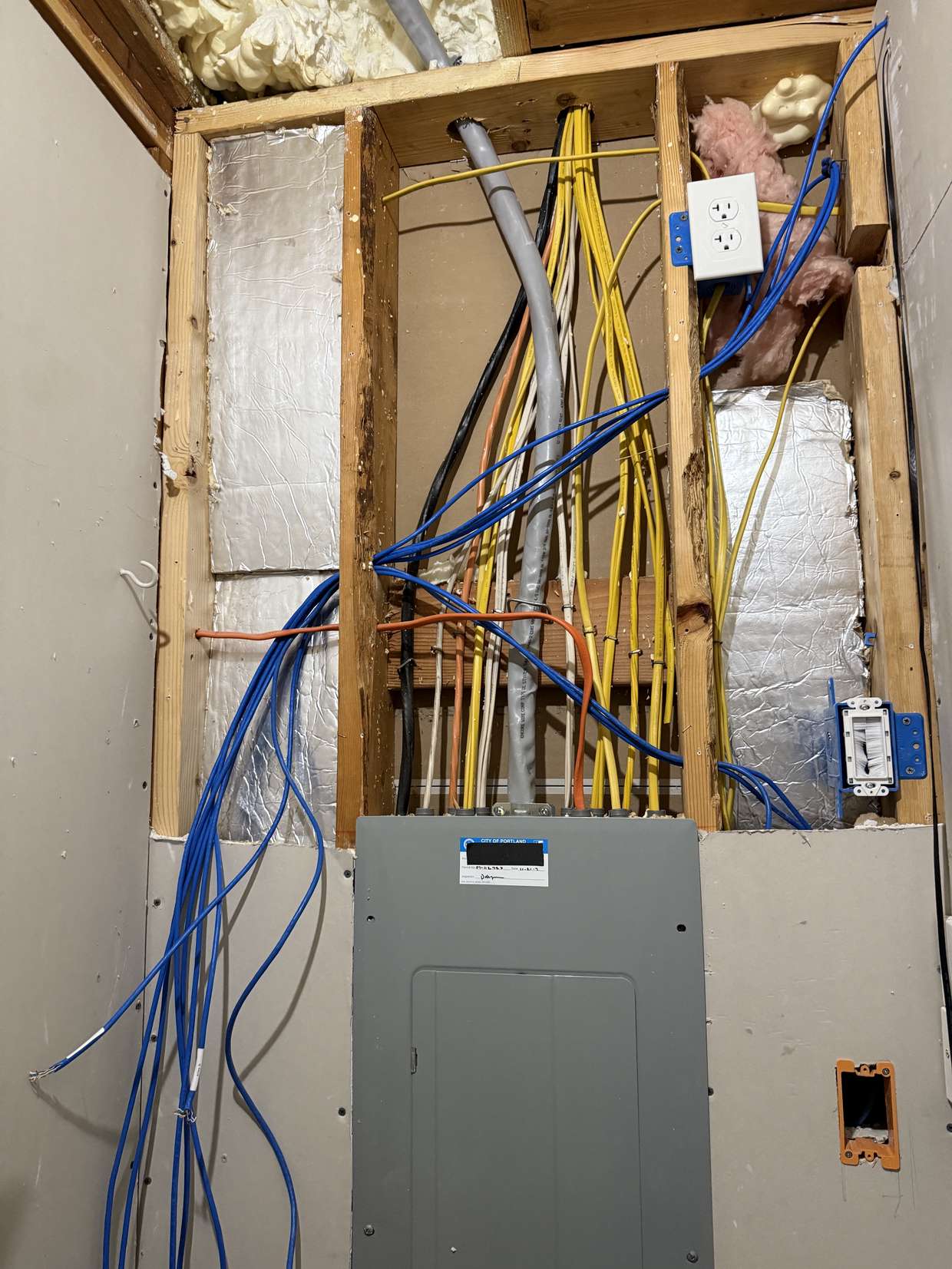 Today I prepped for the drywall crew to come and patch up the walls in the utility closet. I moved the network wires inside the wall to a new location so there will be less exposed wires in the inside, and also moved the fiber cable into the ceiling so it isn't awkwardly draped through the room.