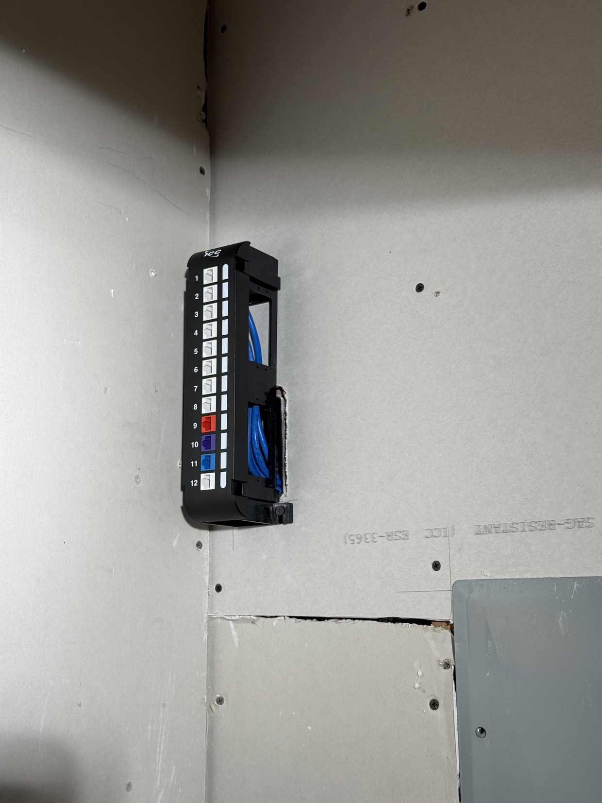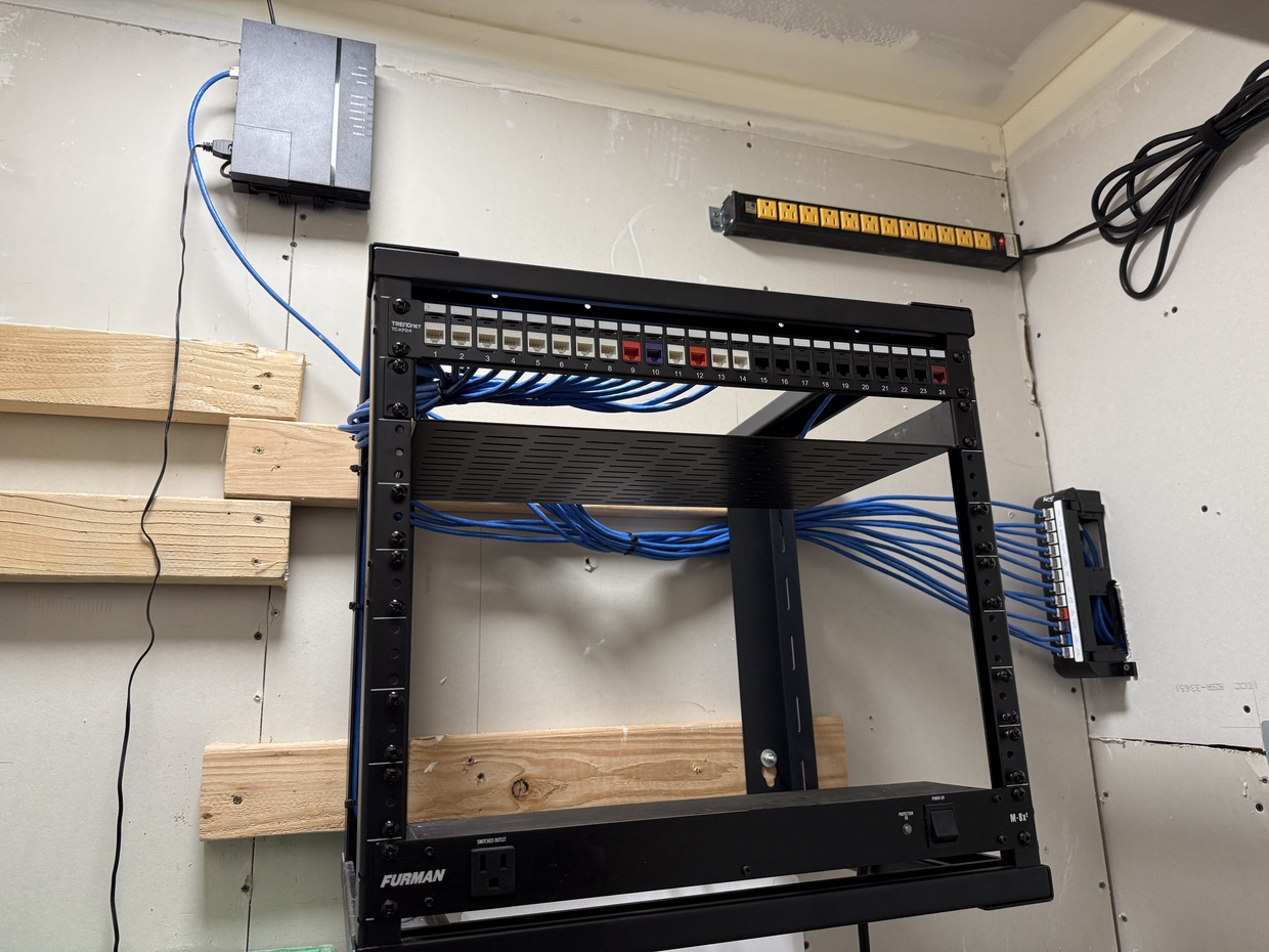 I added a 12-port patch panel in the corner that all the building runs terminate into. Half of these were from the 2019 studio buildout, the other half I've added over the years, with pretty messy cable runs through the space. Now they are all neatly tucked inside the wall and terminated into this patch panel!