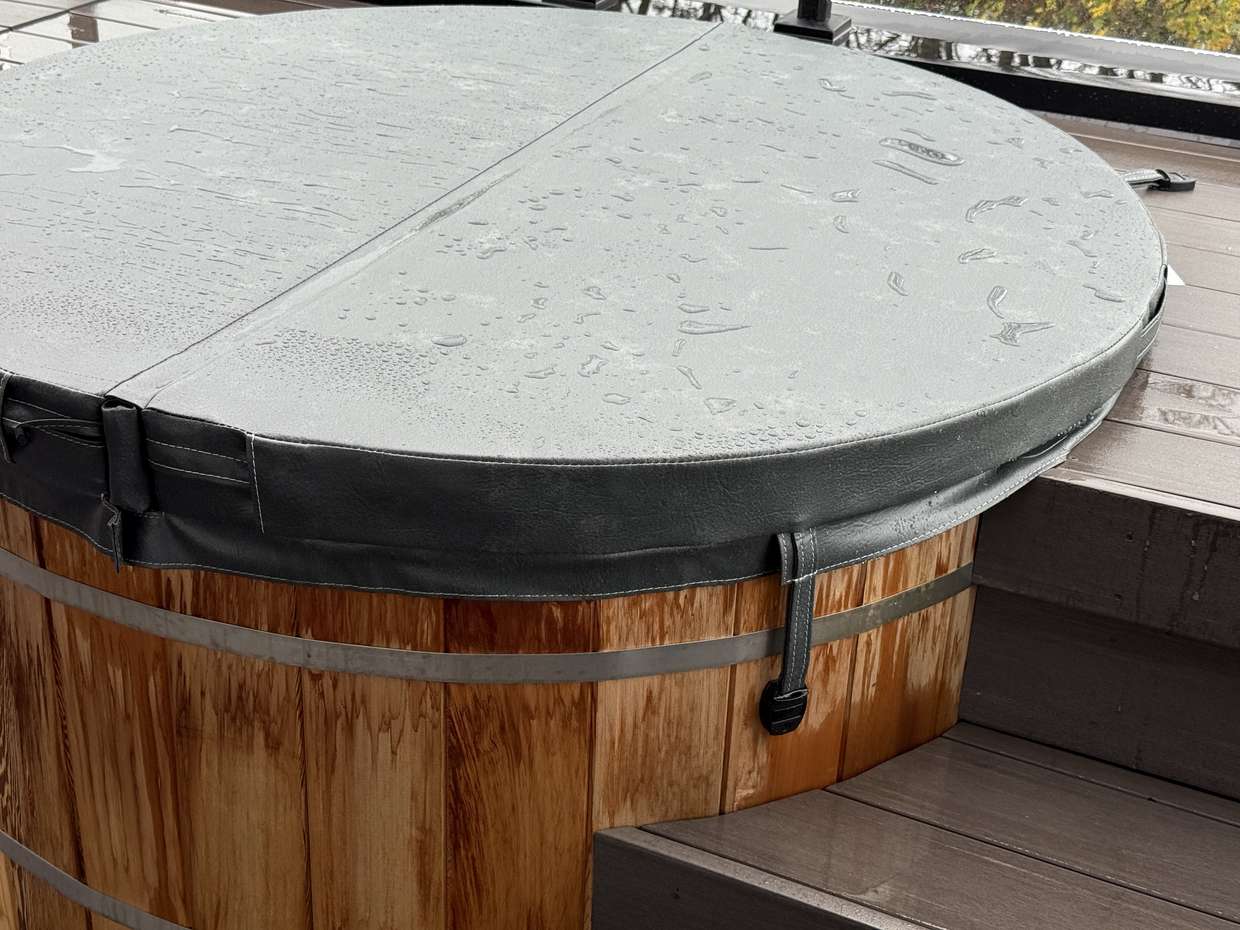 The hot tub cover finally arrived! I had to screw the little clamps in for the straps, and it felt more than a little terrifying to drill a hole in the wood with it full of water.