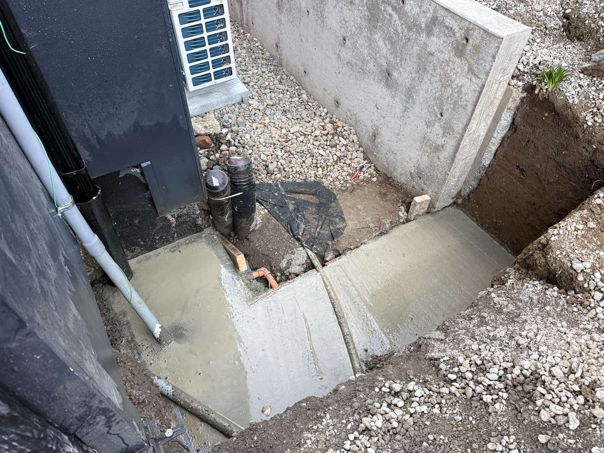 The last of the back wall is getting done the slow way, hand-mixing concrete. The conduits are not going anywhere now.