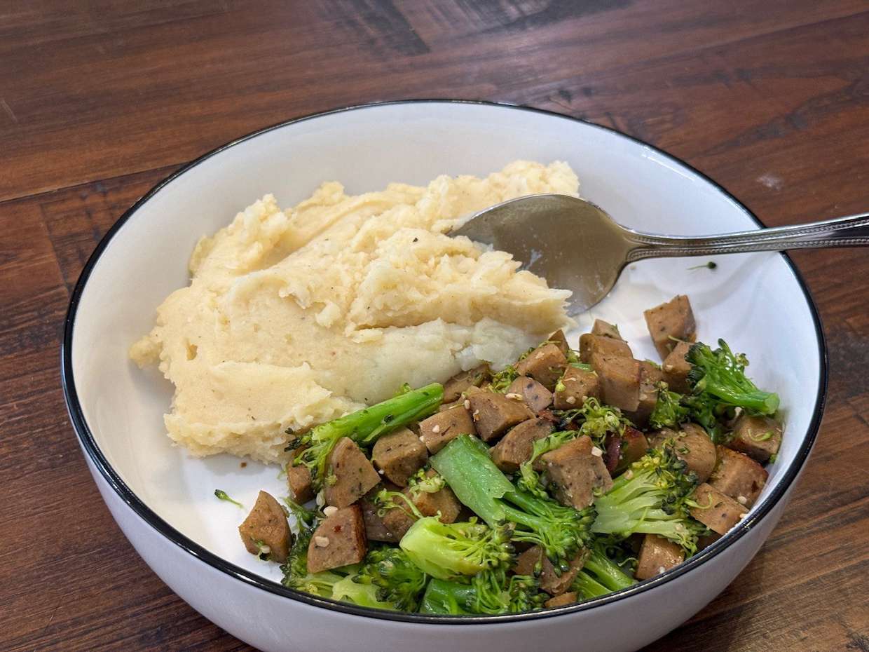 • Mashed Potatoes with Vegan Sausage and Broccoli