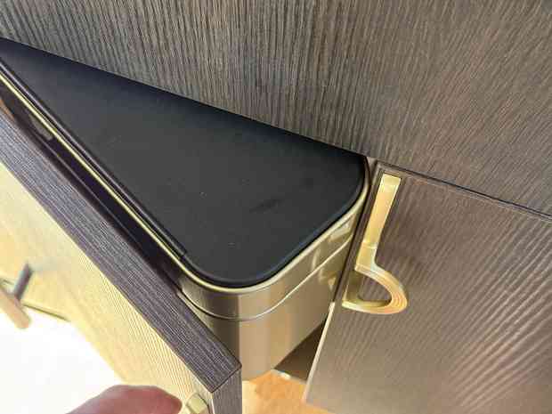 It was bothering me that I messed up the alignment of the compost bin on the cabinet door so I fixed it. There was exactly enough free space between the bin and hinge to move it so it exactly clears the other door.