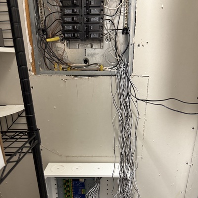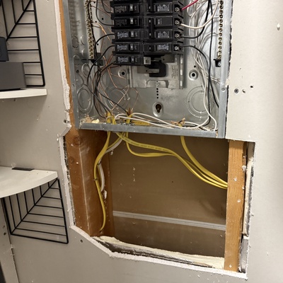 Opened up the drywall under my electrical panel to make room for the electricians to install a new low voltage box for monitoring the power usage of each circuit!