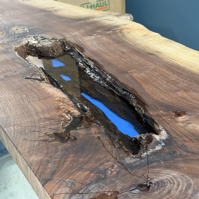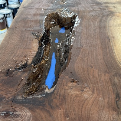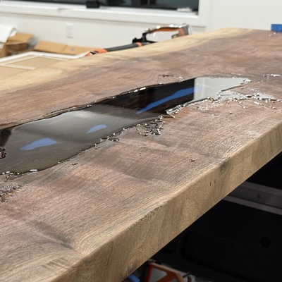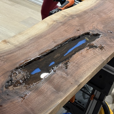 • Did all the prep work for this live edge table and got it cut down to size, but then realized we bought the wrong kind of epoxy so the pour has to start tomorrow.