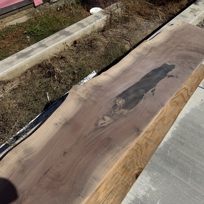 • Sanded down the table with 60-100-120-150-220 grit, and did the small spot epoxy on the other side. If it's not raining tomorrow we can finish sanding and maybe get the finish on!