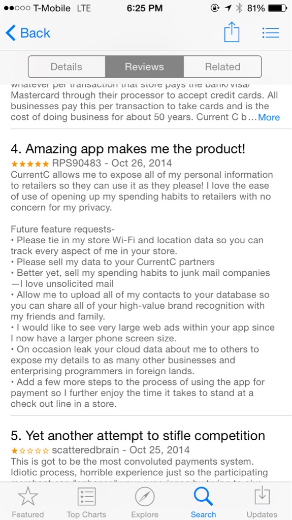 CurrentC allows me to expose all of my personal information to retailers so they can use it as they please! I love the ease of use of opening up my spending habits to retailers with no concern for my privacy. Future feature requests- * Please tie in my store Wi-Fi and location data so you can track every aspect of me in your store. * Please sell my data to your CurrentC partners * Better yet, sell my spending habits to junk mail companies -- I love unsolicited mail * Allow me to upload all of my contacts to your database so you can share all of your high-value brand recognition with my friends and family * I would like to see very large web ads within your app since I now have a larger phone screen size. * On occasion leak your cloud data about me to others to expose my details to as many other businesses and enterprising programmers in foreign lands. * Add a few more steps to the process of using the app for payment so I further enjoy the time it takes to stand at a check out line in a store.
