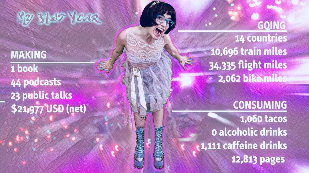 [96/100] Today is my 31st birthday so I dressed up like a punk rock princess 13 yr old! As usual, I will put out my annual report zine soon but here is a mini-report on the last year. This week I am launching a year-long YouTube project... stay tuned! #birthdayportrait #100daysofqs #100dayproject #quantifiedself #punkrockprincess #dollskill #platformboots #glamrock #qs #data #personaldata #debtfreecommunity #travel #selfportrait