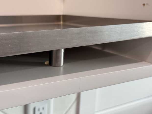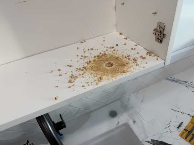 It feels crazy to drill a hole through the perfectly nice cabinets, but this will be great when it's done. Unfortunately the hole didn't line up because the drip tray drain was welded on at a weird angle. So now I need to get a hole saw and make this hole larger.